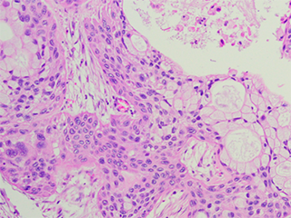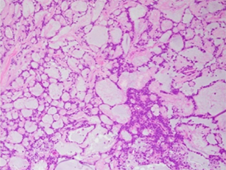膵臓のsolid-pseudopapillary neoplasm(SPN)は、充実性で偽乳頭状の腫瘍細胞増殖パターンを特徴とする稀な膵腫瘍である。我々は、SPNが小嚢胞構造(microcystic SPN)を示しうることを確認しているが(図)、これについてはあまり研究されておらず、小嚢胞性構造を取りうる漿液性嚢胞腫瘍などの他の膵腫瘍と混同される可能性がある。本研究の目的は、小嚢胞性SPNについて臨床病理学的および免疫組織化学的な特徴を明らかにすることである。