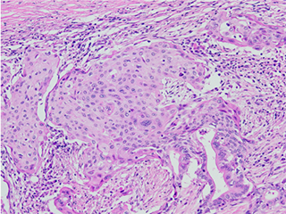 我々は膵腺扁平上皮癌37例を組織学的形態により、膵腺扁平上皮癌NOS(ASC-NOS)症例(図1)とPan-MEC症例(図2)に分類し、両者において融合遺伝子(CRTC1-MAML2及びCRTC3-MAML2)の有無、ムチンコア蛋白(MUC)発現を解析した。